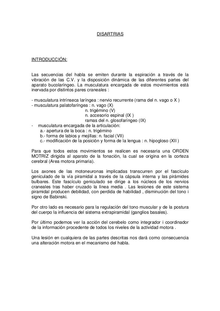 La disartria puede ser un síntoma de una enfermedad grave. Ambas conforman la motoneurona superior. La disartria se define como un trastorno motor del habla de origen neurológico que está caracterizado por lentitud, debilidad, imprecisión, incoordinación, movimientos involuntarios y/o alteración del tono de la musculatura implicada en el habla. Enjoy the videos and music you love, upload original content, and share it all with friends, family, and the world on youtube. Sua capacidade de compreensão e escrita são …