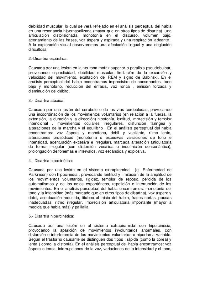Pdf Disartria Espastica Rehabilitacion De La Fonacion De Un Paciente Con Traumatismo Craneo Encefalico from i1.rgstatic.net En este caso, la lesión está localizada en la neurona motriz inferior. Duffy (1995, 2005, citado en acosta montelongo & garcía hernández, 2016), agrega que resulta de anormalidades en el rango, la regularidad, la velocidad, la fuerza, la exactitud de los movimientos requeridos para el control de la respiración, la prosodia en la producción del habla,… Veja mais sobre como identificar. Es importante conocer y detectar los síntomas de este padecimiento para tomar los correctivos necesarios y así garantizarle al niño un desarrollo físico y psicológico integral. • disartria discinética • disartria mixta por la toma articulatoria: Enjoy the videos and music you love, upload original content, and share it all with friends, family, and the world on youtube. El defecto expresivo es permanente y uniforme. Las personas con esta afección tienen dificultad para controlar apropiadamente uno o más músculos que se utilizan para hablar.